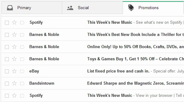 1. The specific Promotions tab allows marketing emails to be seen as opposed to being buried or overlooked in a crowded inbox where promotional material is often considered unfavorable. With their own tab, these emails are given space and a sense of importance; users are notified with a highlighted number when they have new emails waiting for them in their tabs, making viewers more inclined to click through to specifically see these new messages.