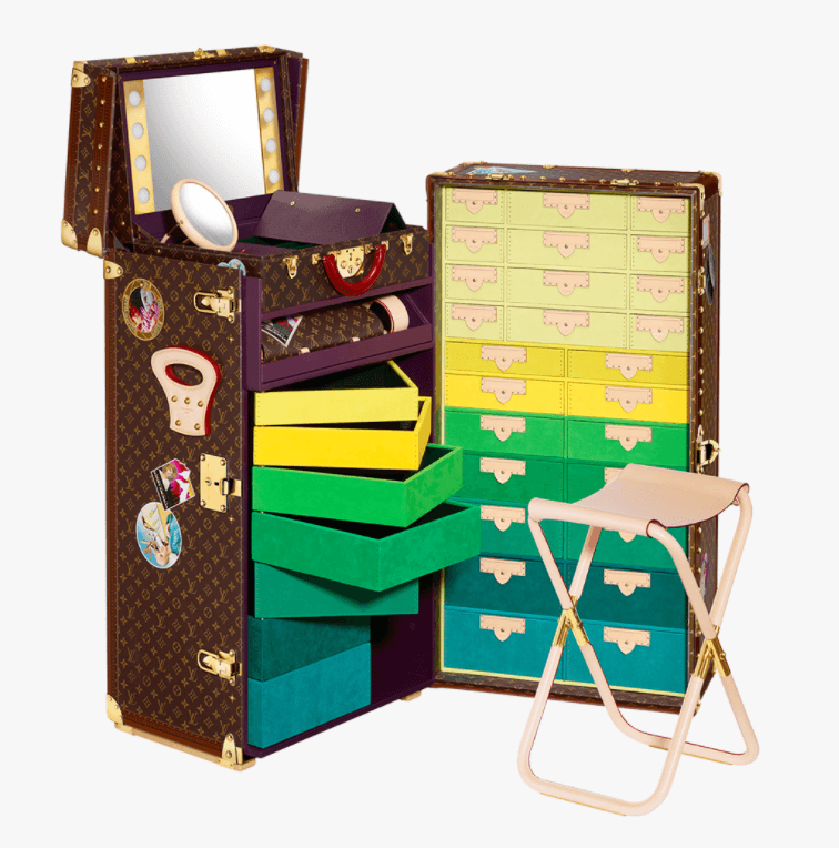 Enter Louis Vuitton, the 200-year-old brand known today for making handbags, briefcases, wallets, and now watches, clothing and other brilliant line extensions. What they were originally known for were steamer trunks in all shapes and sizes and all purposes of the day, a writing desk inside a trunk, makeup and personal care, chauffeur kits, driving luggage, and of course, their eponymous handbags. All were beautifully handcrafted, whether back in 1865 or in collaboration with famous artists like Cindy Sherman (featured right).