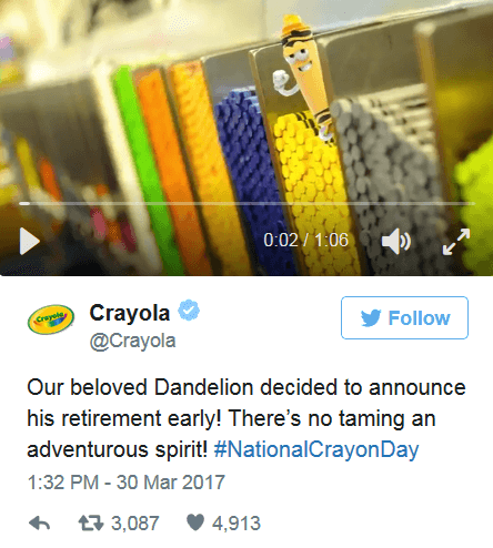 Crayola. Crayola planned to announce which color they were retiring from their 24-count box in a big way: with a live Facebook event in Times Square on National Crayon Day. Unfortunately for Crayola, a Target in Marlton, NJ released the box announcing that Dandelion was getting the boot before the big reveal, and the photo evidence quickly made the rounds on social media. In a move that showed that the brand’s social media team may have planned for spoilers, Crayola made the most of a bad situation, tweeting Dandelion’s retirement early and still sticking to their New York City celebration without the reveal. The initial leak was met with outrage, but continuing with the event, turning it into a celebration rather than a reveal, and having back-up posts at the ready helped dull the noise very quickly.